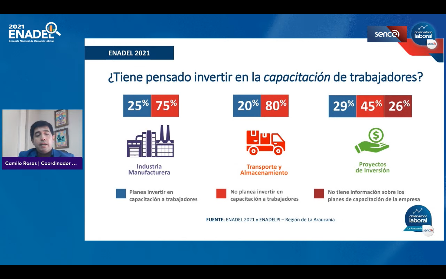 Por tercer año consecutivo, el Observatorio Laboral Araucanía dio a conocer los resultados de la Encuesta Nacional de Demanda Laboral, ENADEL 2021, estudio que es realizado por la red de Observatorios Laborales de SENCE, y da cuenta de las necesidades de las empresas en cuanto a puestos de trabajos más demandados, ya con datos más consolidados respecto de las modificaciones asociadas a la pandemia.